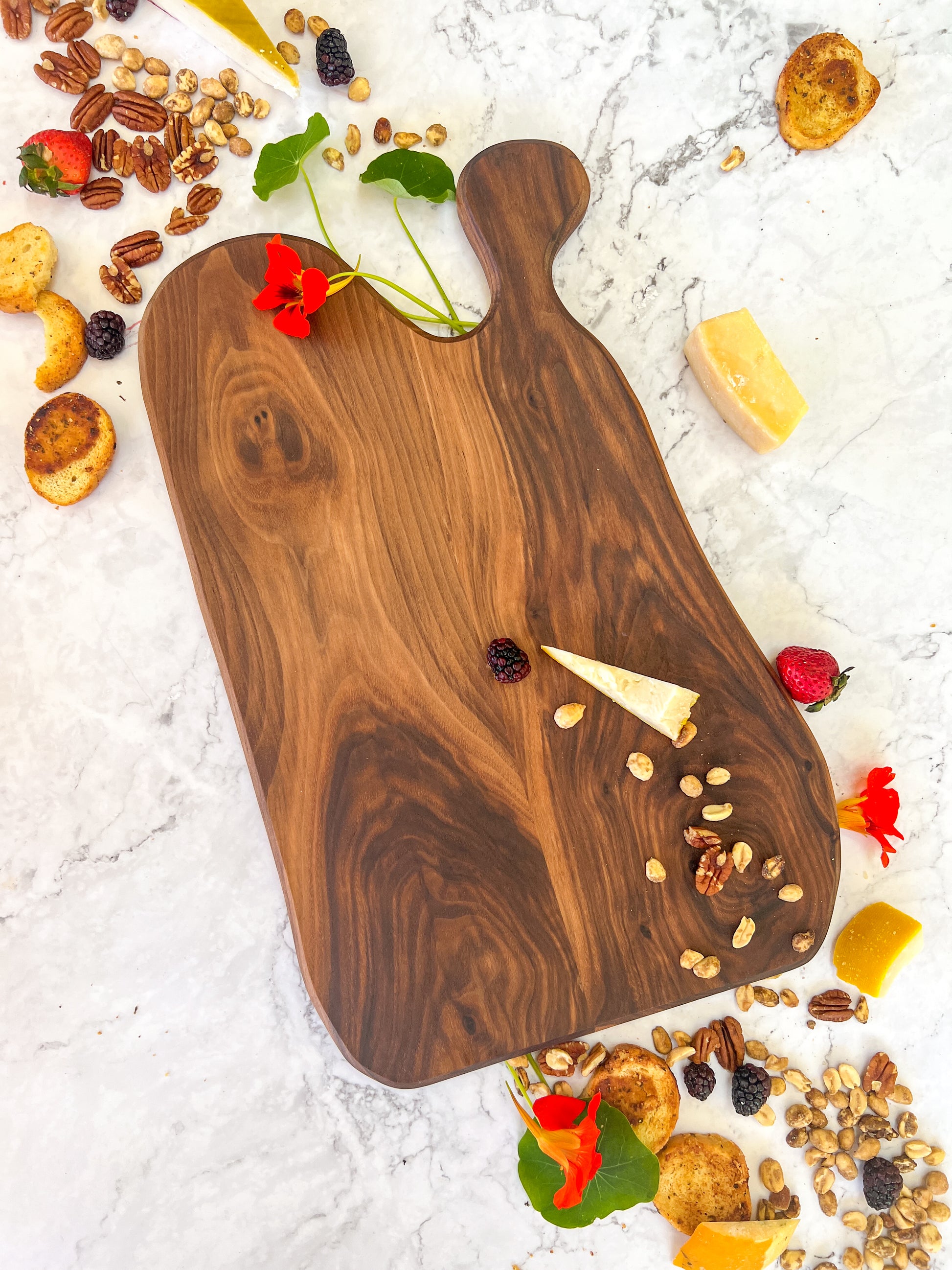 The Daphne Nosh Board is an exquisite handmade one-of-a-kind addition to your kitchen or dining room. Crafted with the utmost care and attention to detail, this board is a functional piece of art.