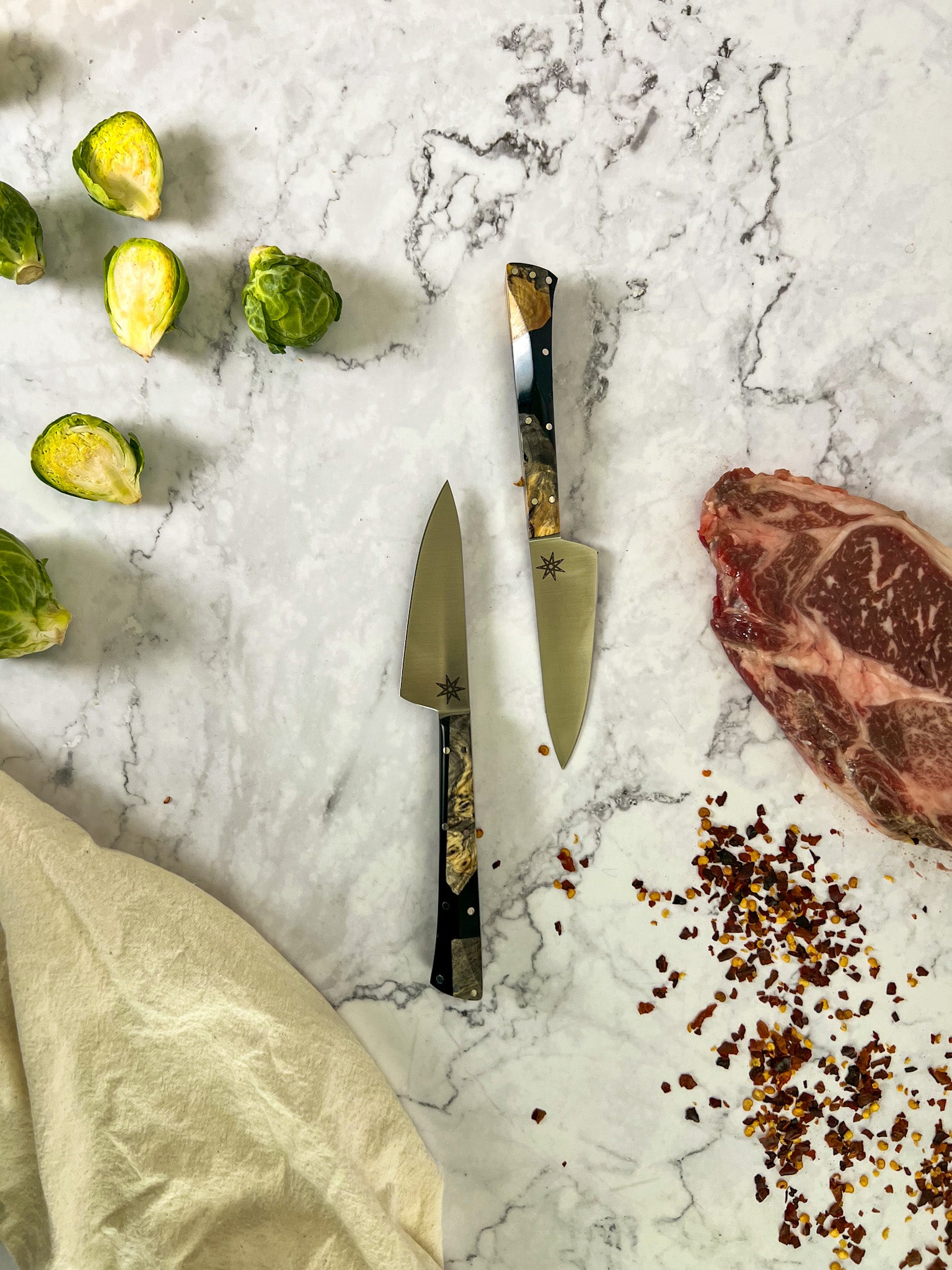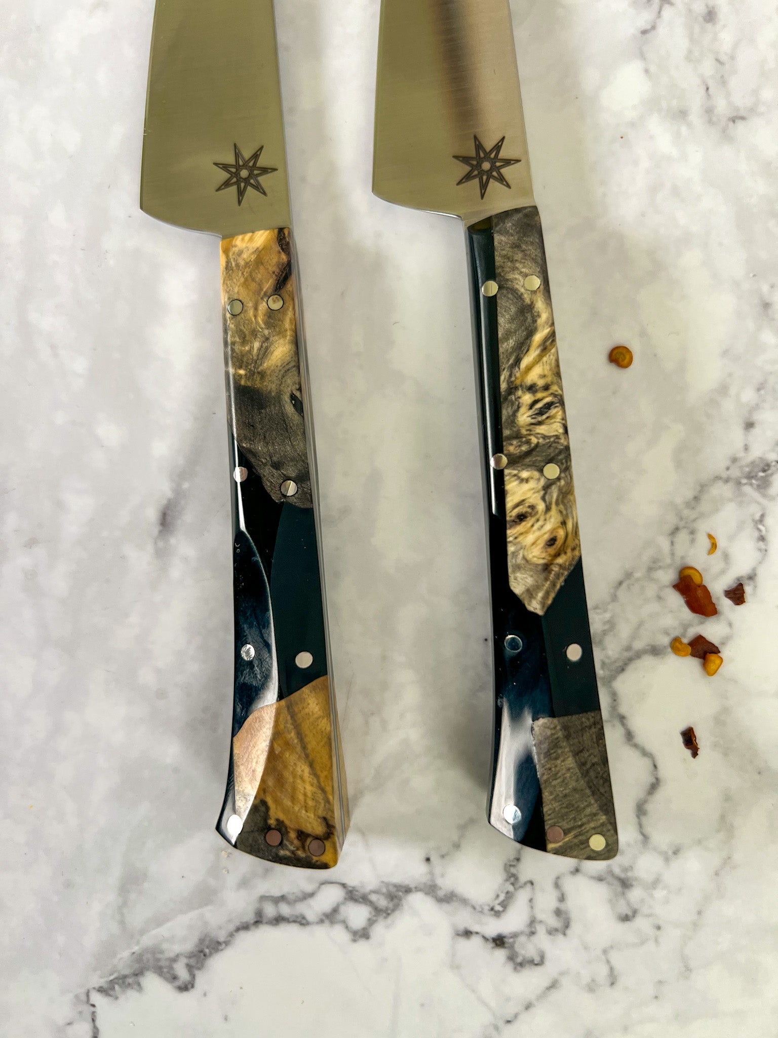 Inspired by the high desert Nevada night skies. Made with Nitro-V stainless steel, which is known for its high corrosion resistance and long-lasting edge retention. The handles showcase live-edge Buckeye Burl set in black midnight resin, blue metallic flakes, and nickel silver frame pinning.