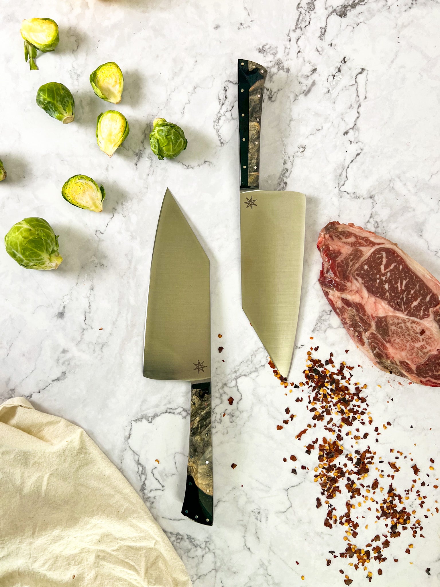 If our 8.5" Chef knife is the "workhorse," our 7.5" Chopper is the "bull." This unique kitchen knife has the thinness and balance of a chef knife to accomplish any job but with added blade height, which helps with straight and accurate cuts. The 27.5° drop-point is not only visually appealing; it is fantastic for precision work at the tip. Hand crafted in Reno, Nevada USA