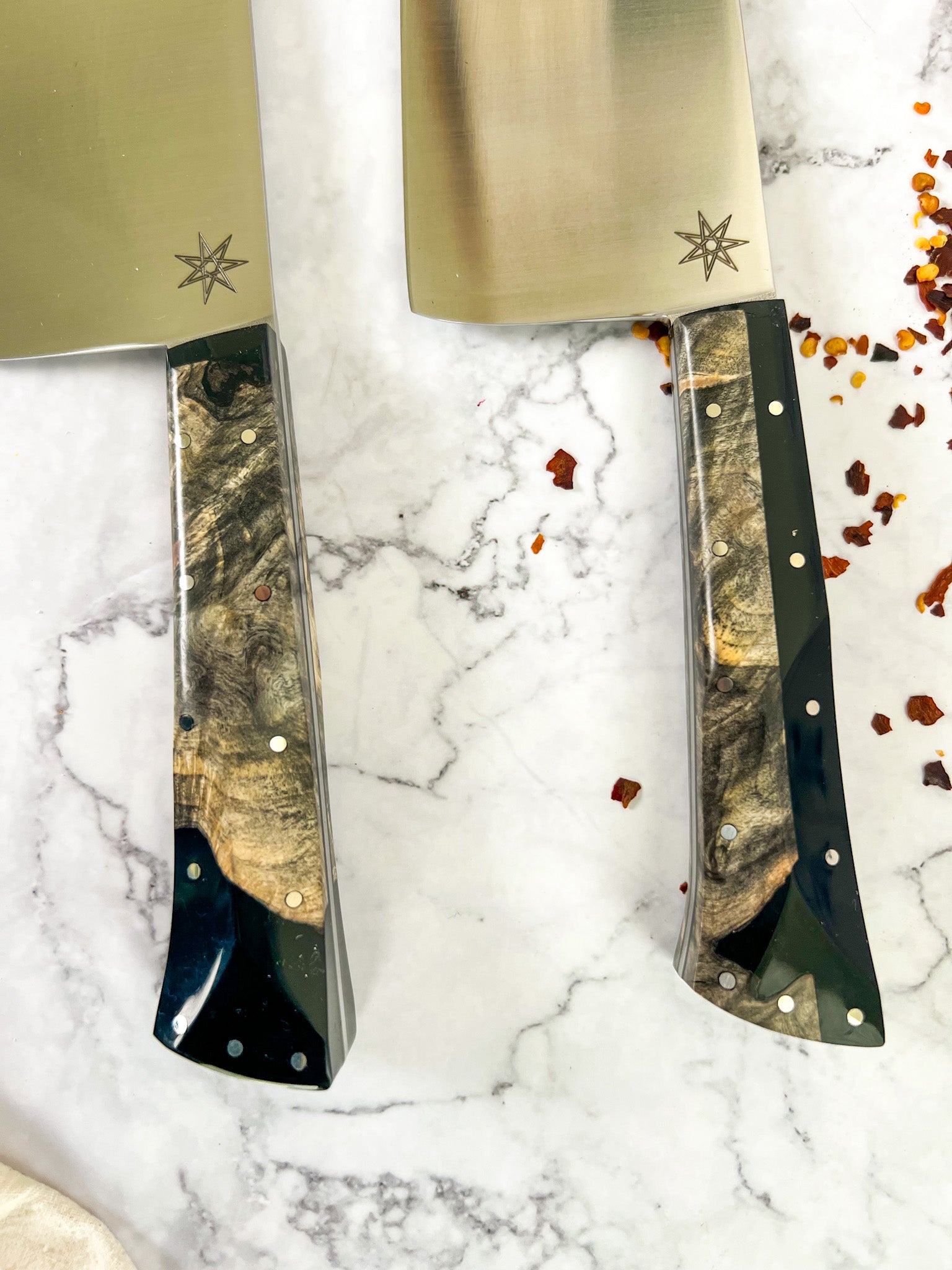 Inspired by the high desert Nevada night skies. Made with Nitro-V stainless steel, which is known for its high corrosion resistance and long-lasting edge retention. The handles showcase live-edge Buckeye Burl set in black midnight resin, blue metallic flakes, and nickel silver frame pinning.