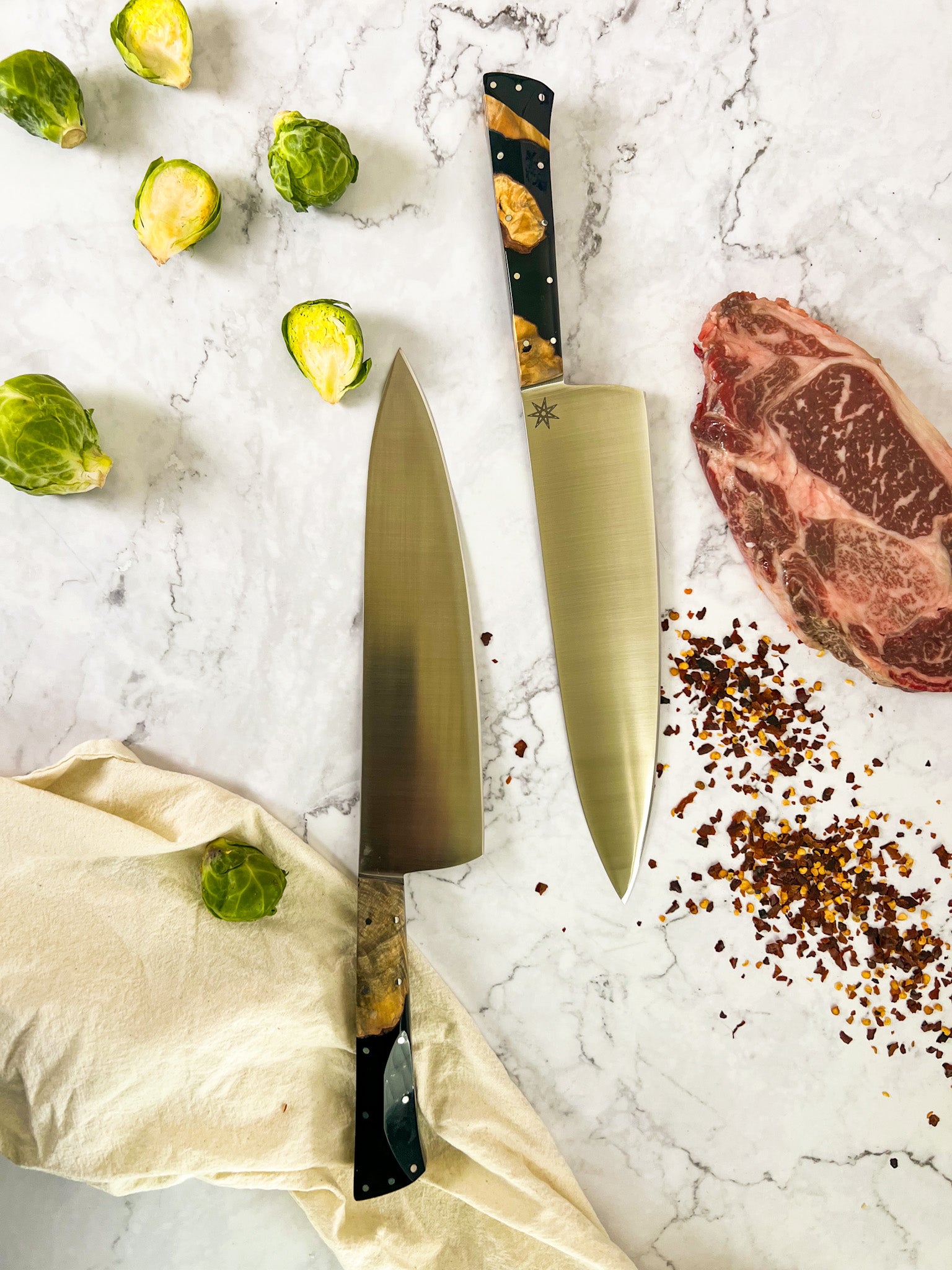 Our most popular size, the 8.5” blade length is a size most people are familiar with whether they use Western or Japanese style chef knives. The length of the blade can handle larger projects, as easily as it can be used for everyday cutting. Hand crafted in Reno, Nevada USA.