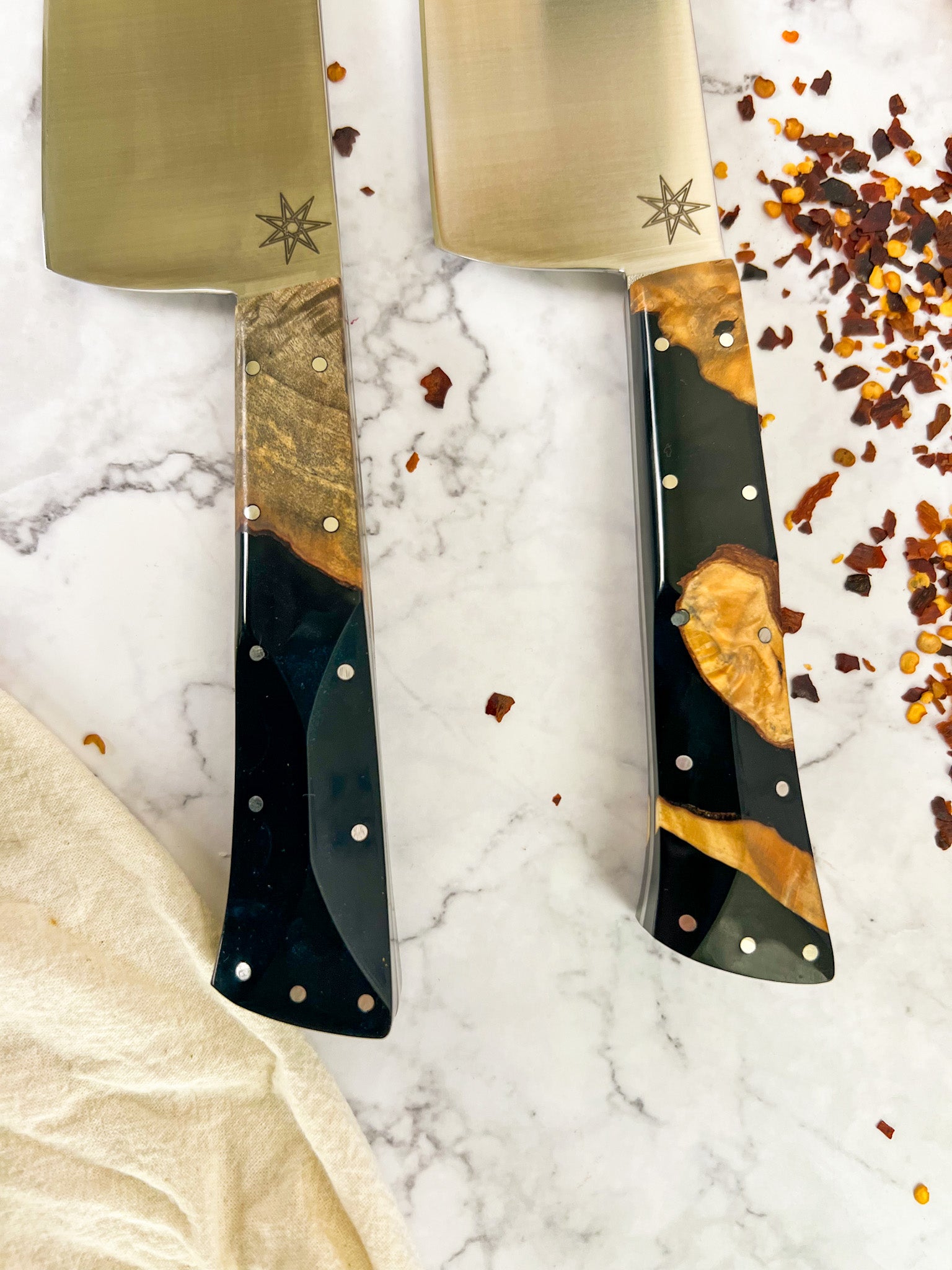 Inspired by the high desert Nevada night skies. Made with Nitro-V stainless steel, which is known for its high corrosion resistance and long-lasting edge retention. The handles showcase live-edge Buckeye Burl set in black midnight resin, blue metallic flakes, and nickel silver frame pinning.