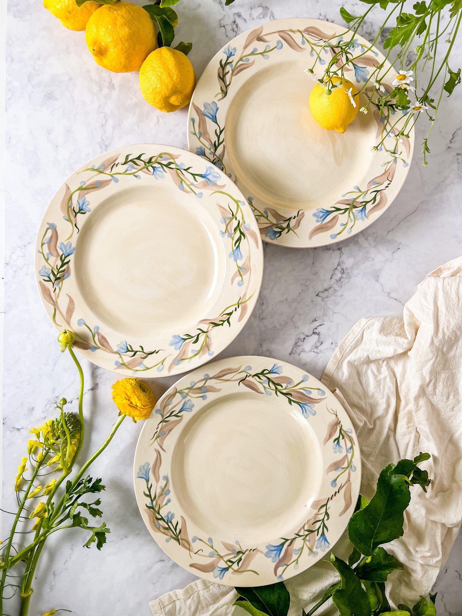 Blue Flax flowers curl around the edges of this dinnerware, inspired by unruly gardens. Each piece is hand painted which gives them their own personality. A classic and romantic frame for your springtime luncheons and crisp al fresco dinners. Made in the USA.