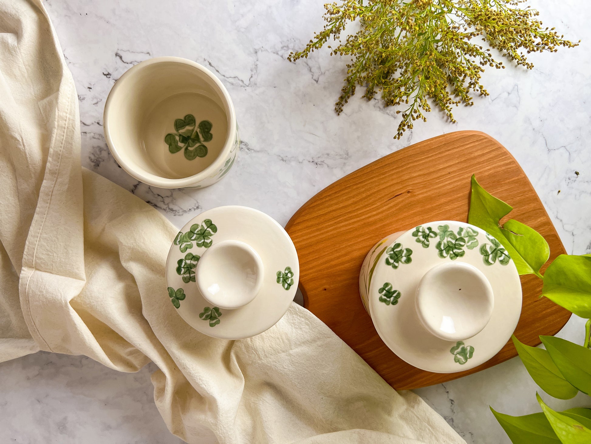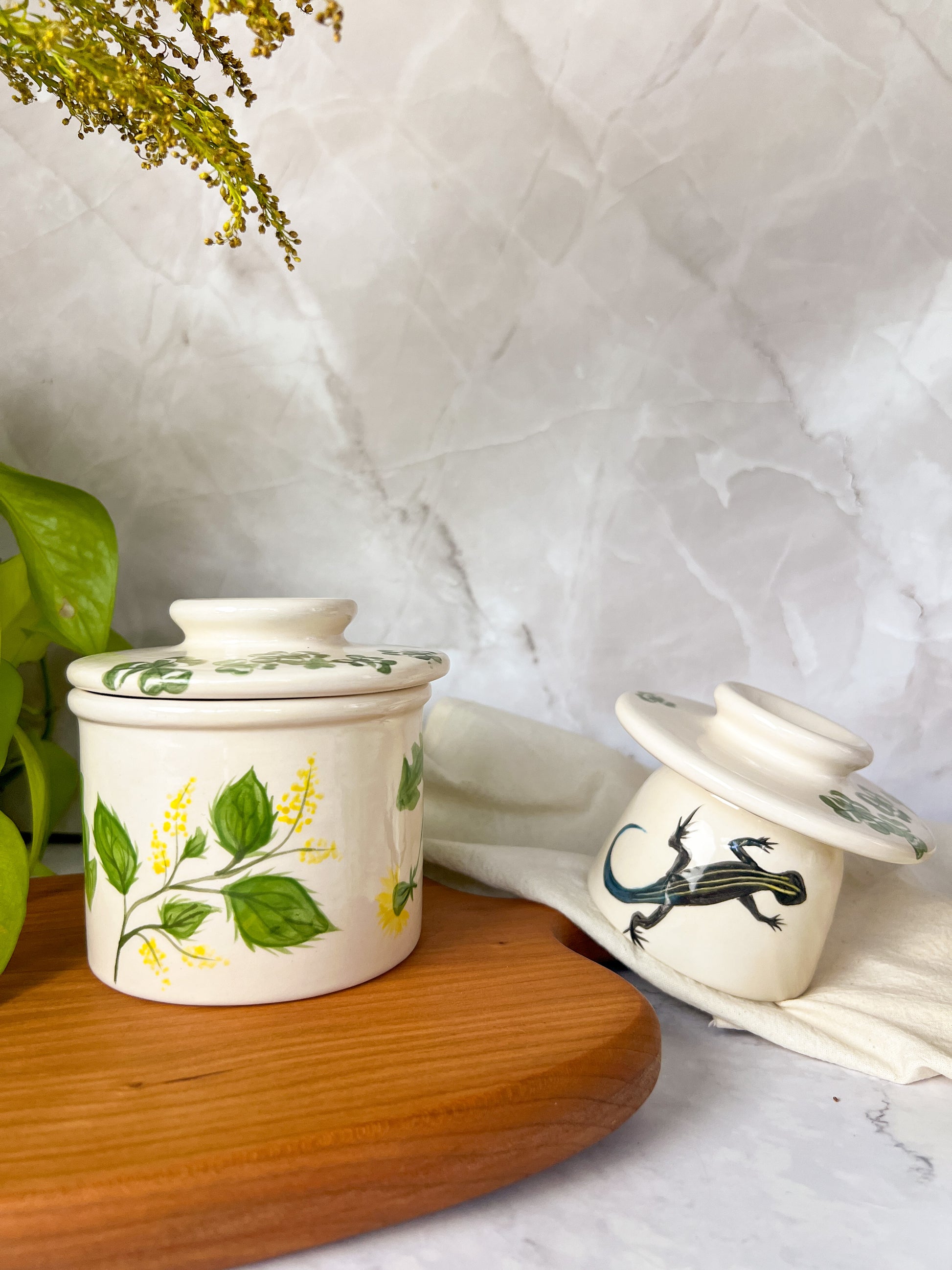 An exquisitely hand painted “In The Weeds" Butter Bell, where art and nature intertwine to bring you a celebration of the forgotten medicine, weeds! Inspired by the wisdom of these often misunderstood plants, this unique design pays homage to the intrinsic beauty and remarkable utility of Clover, Stinging Nettle, and Dandelions. A clever skink hides on the interior of the bell.