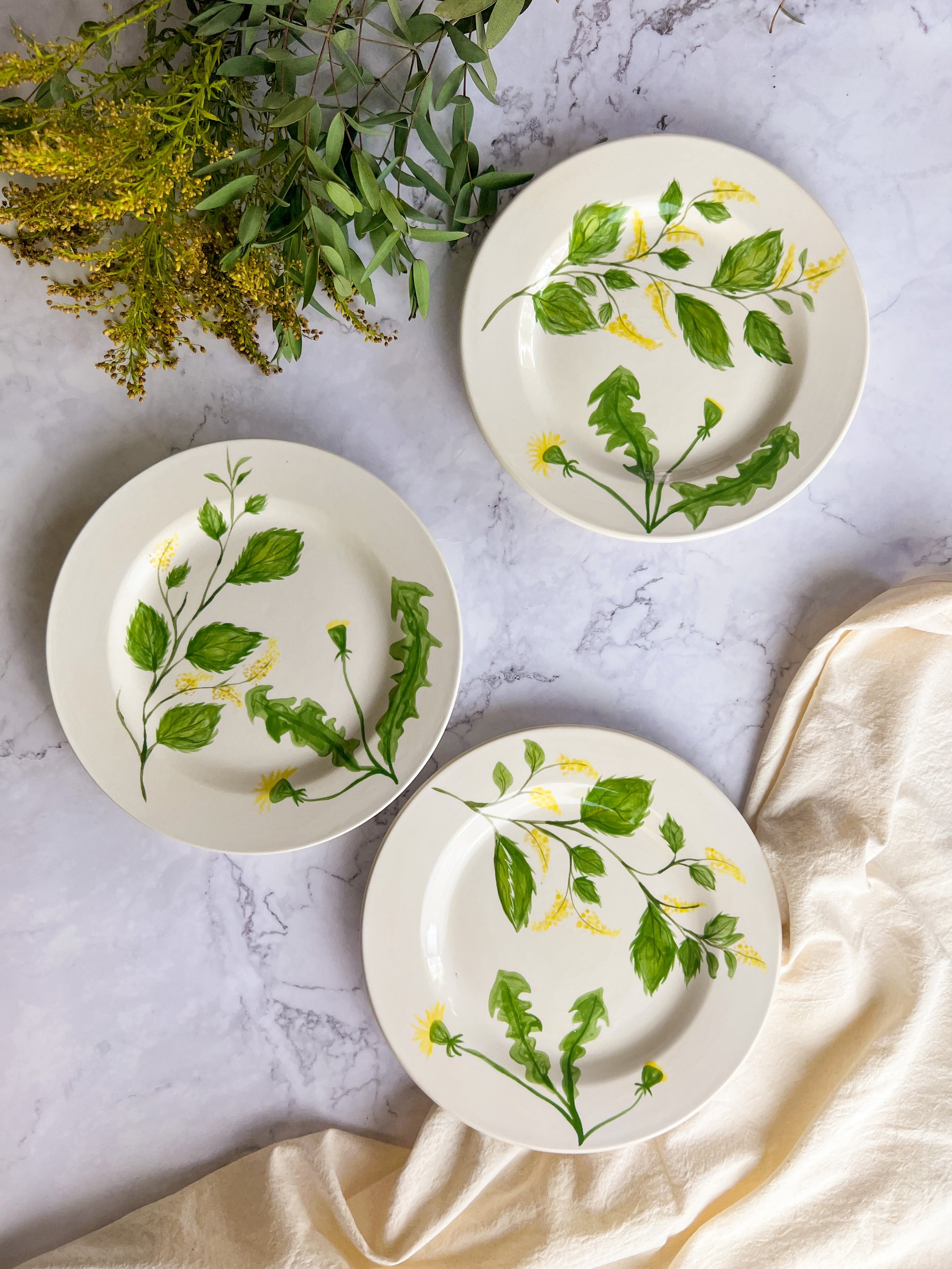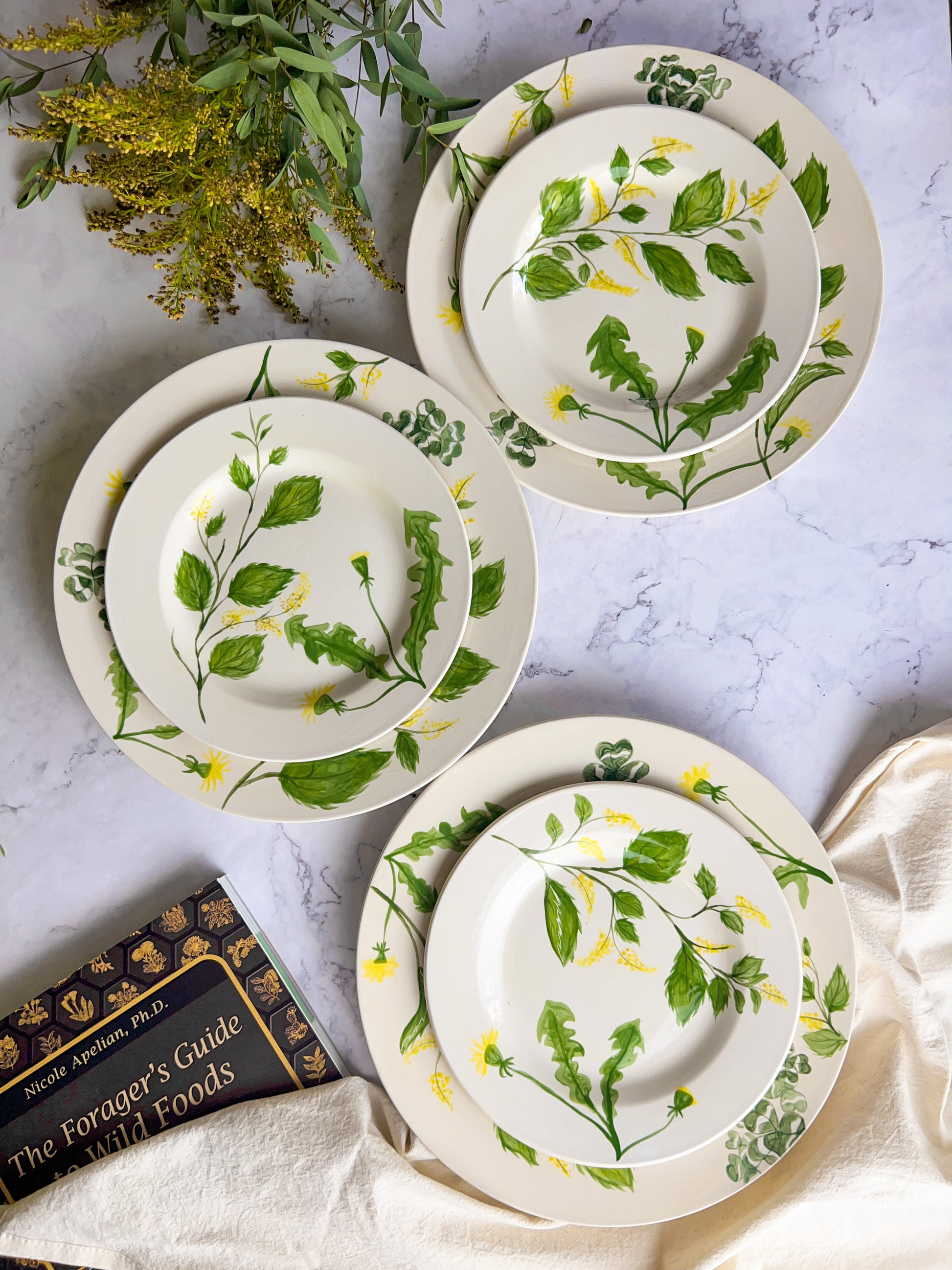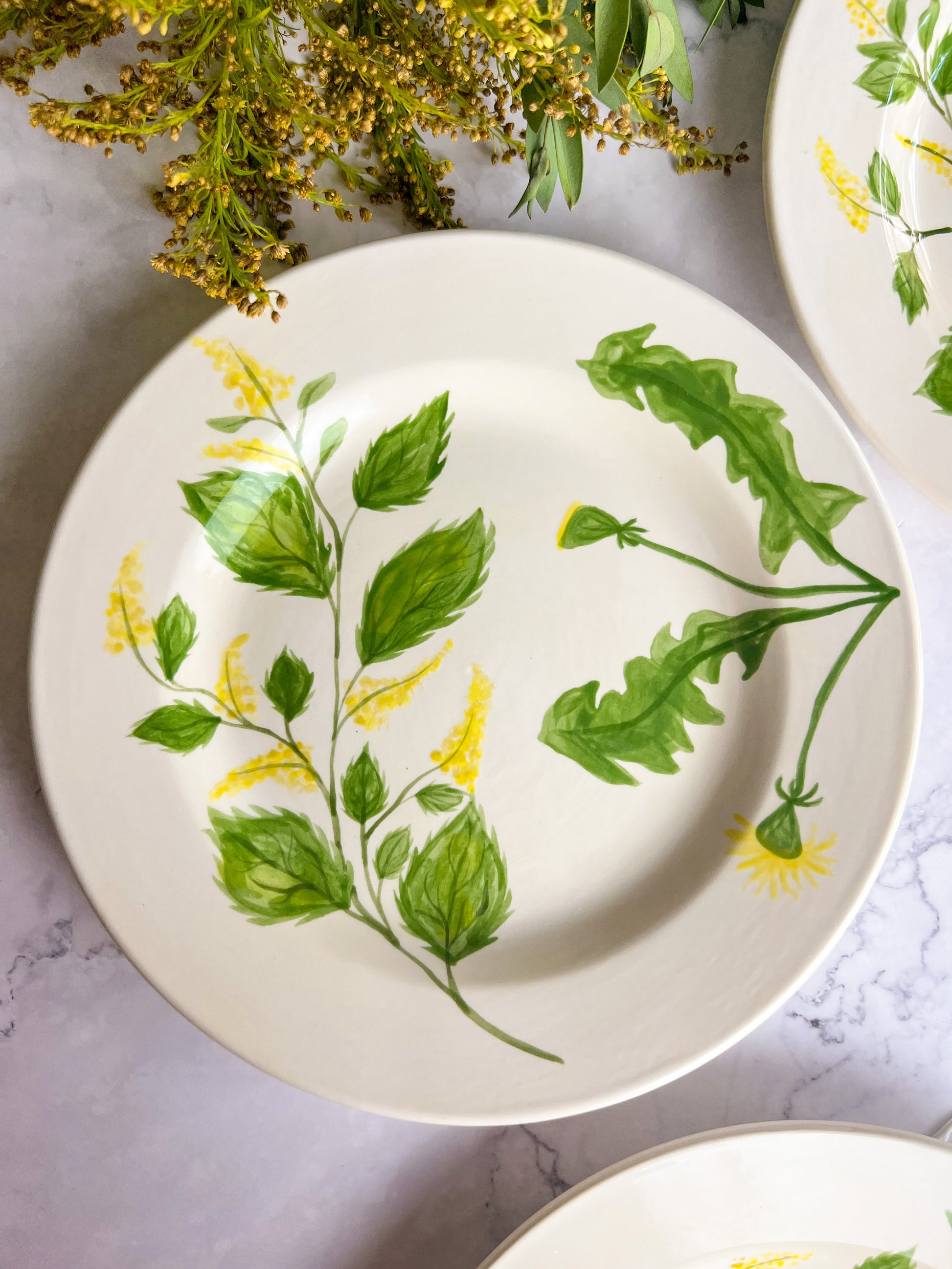 An exquisitely hand painted "In The Weeds" dessert plate, where art and nature intertwine to bring you a celebration of the forgotten medicine, weeds! Inspired by the wisdom of these often misunderstood plants, this unique design pays homage to the intrinsic beauty and remarkable utility of Clover, Stinging Nettle, and Dandelions.