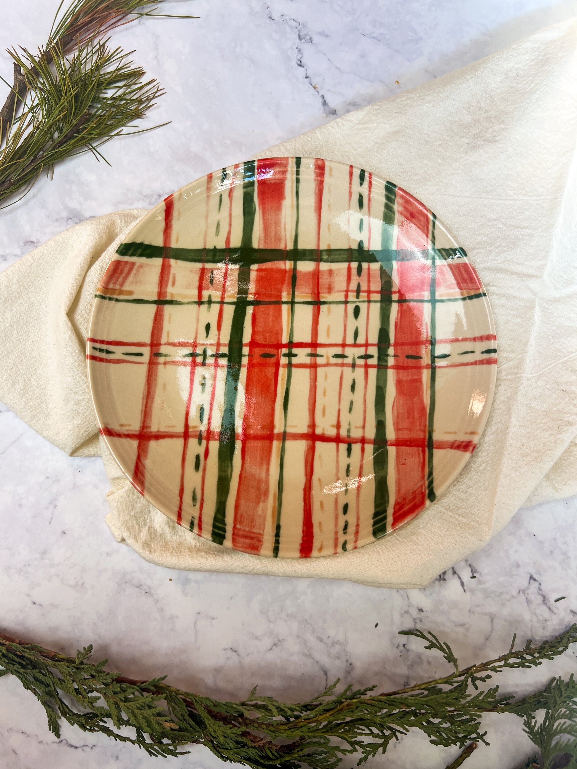 Inspired by vintage wrapping paper and textiles, this hand painted cookie plate is an instant heirloom piece. Great for serving at parties or setting out for Santa’s visit. This is a limited edition plate. There is only one