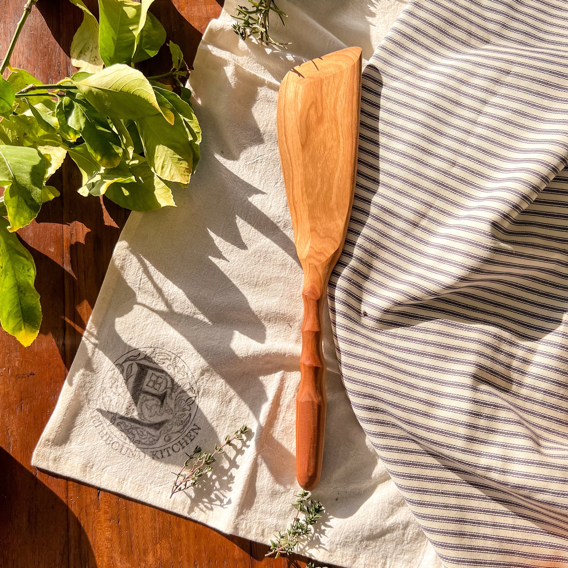 This handmade spatula features a tapered blade with sharp bevels on the ends to help with scraping pans. Ideally suited for cast-iron and non-stick pans. Designed with a chiseled handle for a comfortable ergonomic grip. Made from ethically harvested urban lumber and finished with organic olive oil and beeswax. This is a handmade product, so each piece has its own character. Made with intention from pre fallen Cherry in Rock Island, Illinois USA.